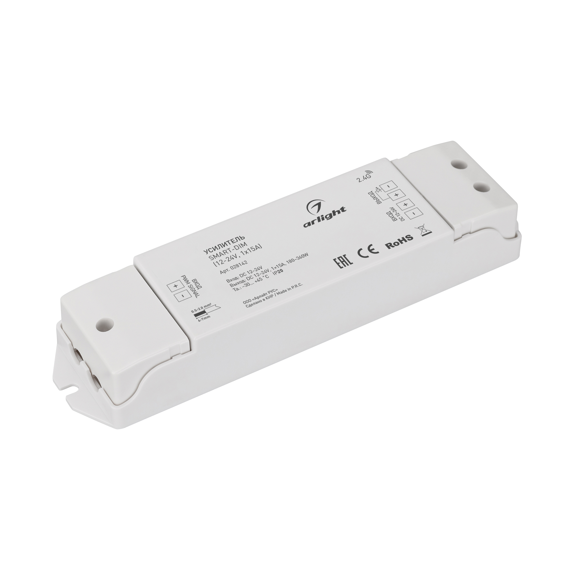 1-канальный усилитель, предназначенный для увеличения мощности и подключения большего количества одноцветных светодиодных лент. Питание изделия имеет диапазон напряжений от 12В до 24В, максимальный ток 15А на 1 канал, максимальная мощность 180-360Вт (в зависимости от напряжения питания). Усилитель имеет пластиковый корпус белого цвета. Габариты изделия составляют 175x45x27 мм.