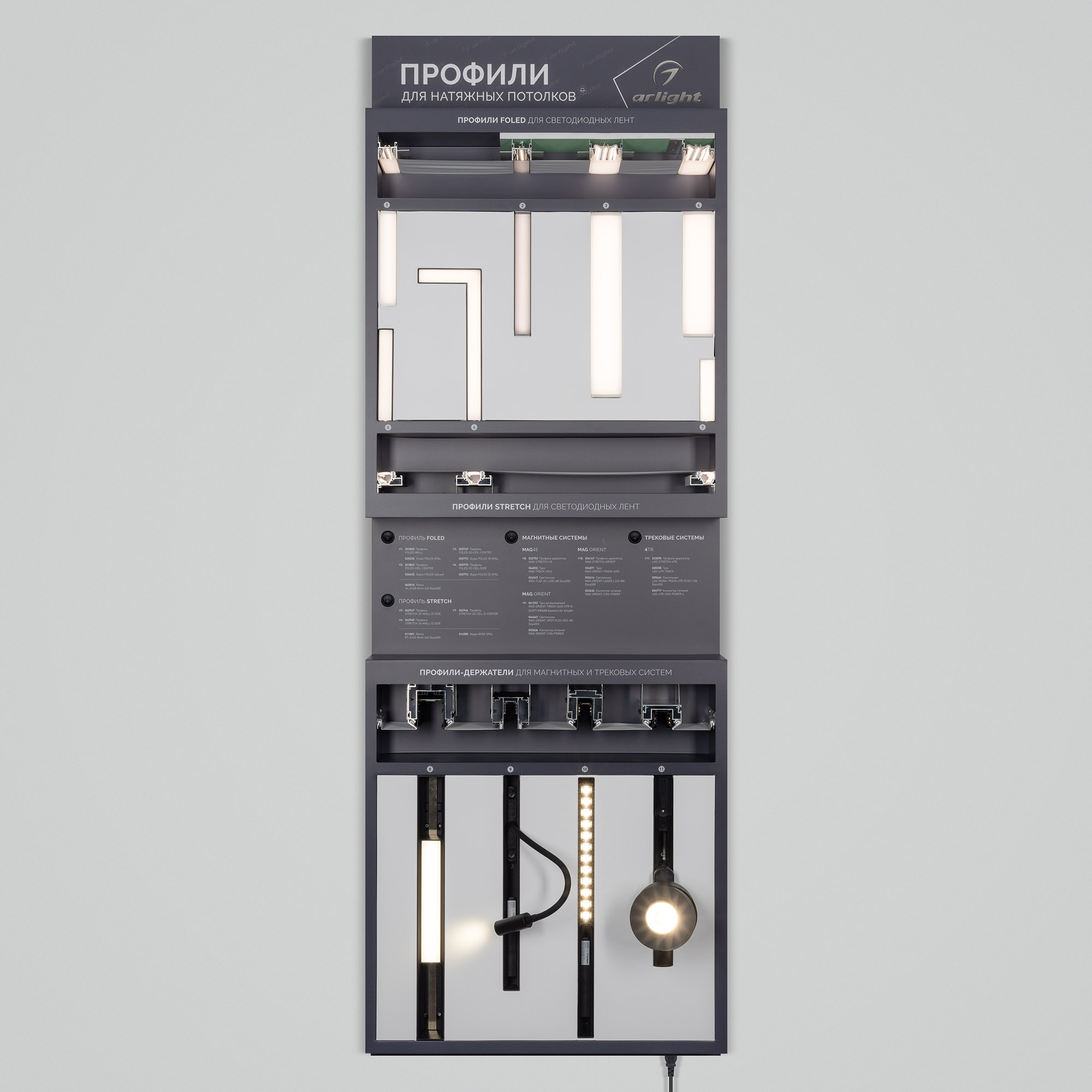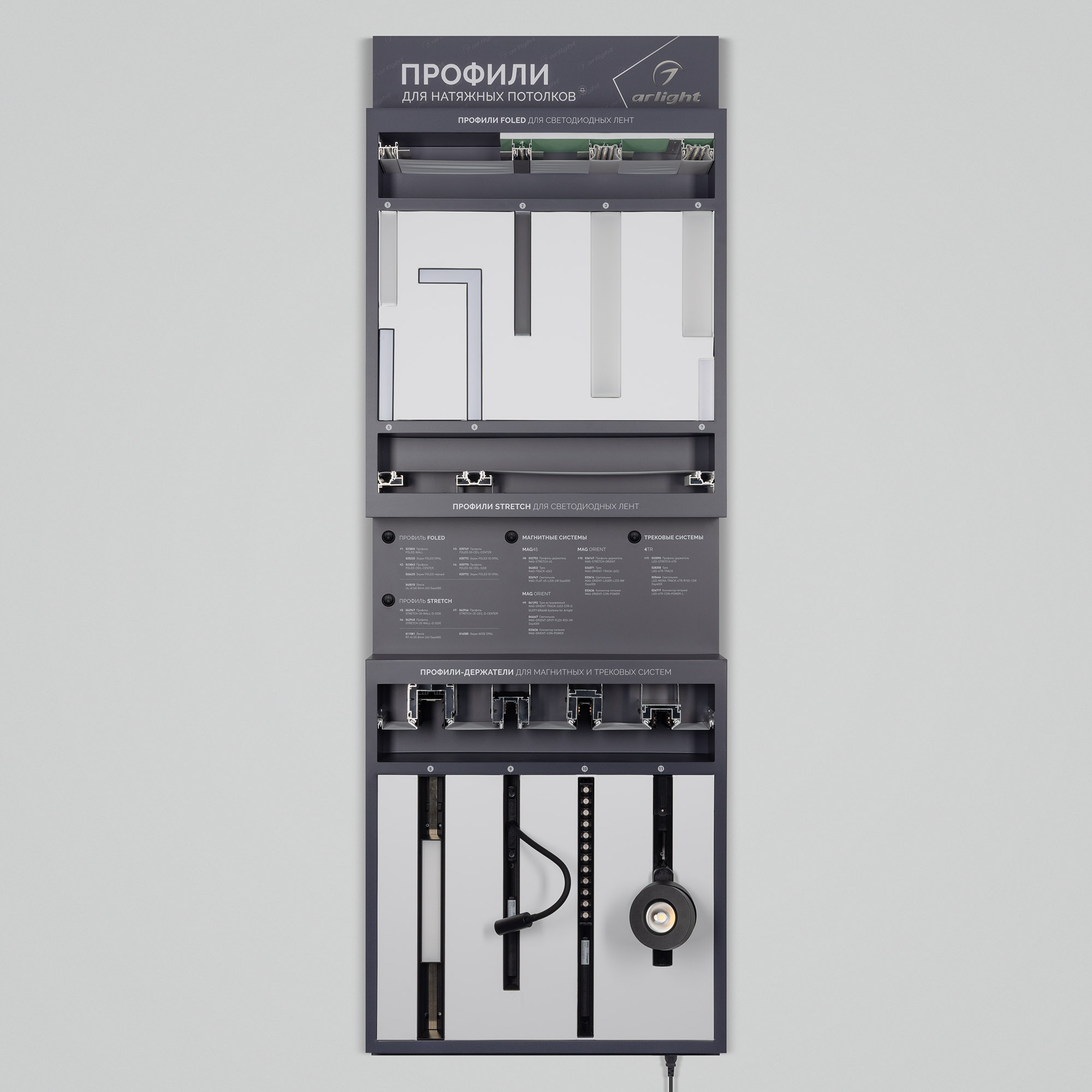 На стенде представлен ассортимент профилей Arlight для натяжных потолков: