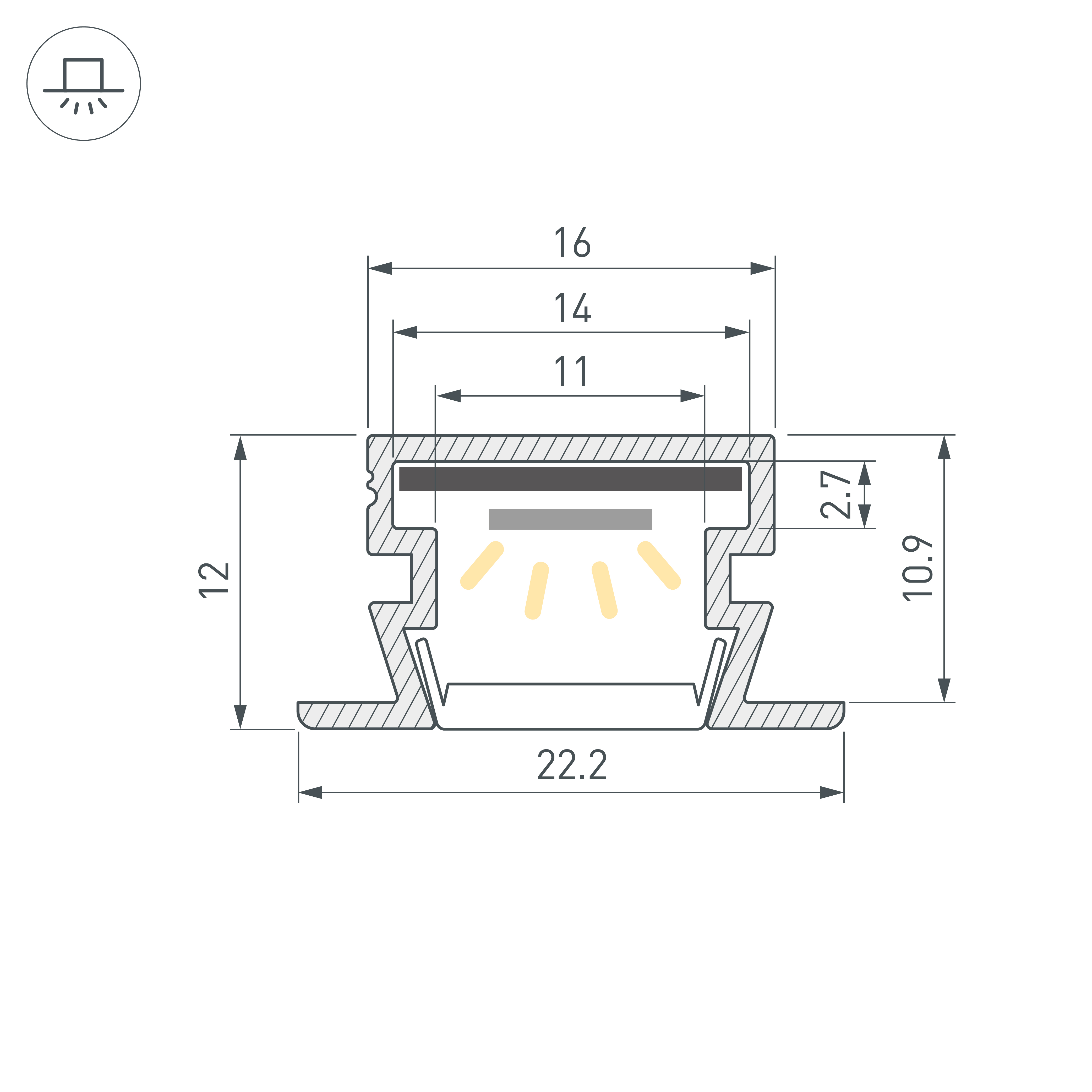 Встраиваемый профиль черного цвета с накладным фланцем из анодированного алюминия для контурной подсветки. Габаритные размеры профиля составляют 3000 мм в длину, 22,2 мм в ширину и 12 мм в высоту. Площадка для установки светодиодных лент позволяет использовать ленту шириной до 14 мм и мощностью до 16,4 Вт/м. Это обеспечивает гибкость в выборе светодиодных лент и создает потрясающие световые решения. Экраны, заглушки и другие аксессуары не включены в комплект и приобретаются отдельно. Цена указана за 1 метр профиля. Отличное решение для создания современных световых проектов.