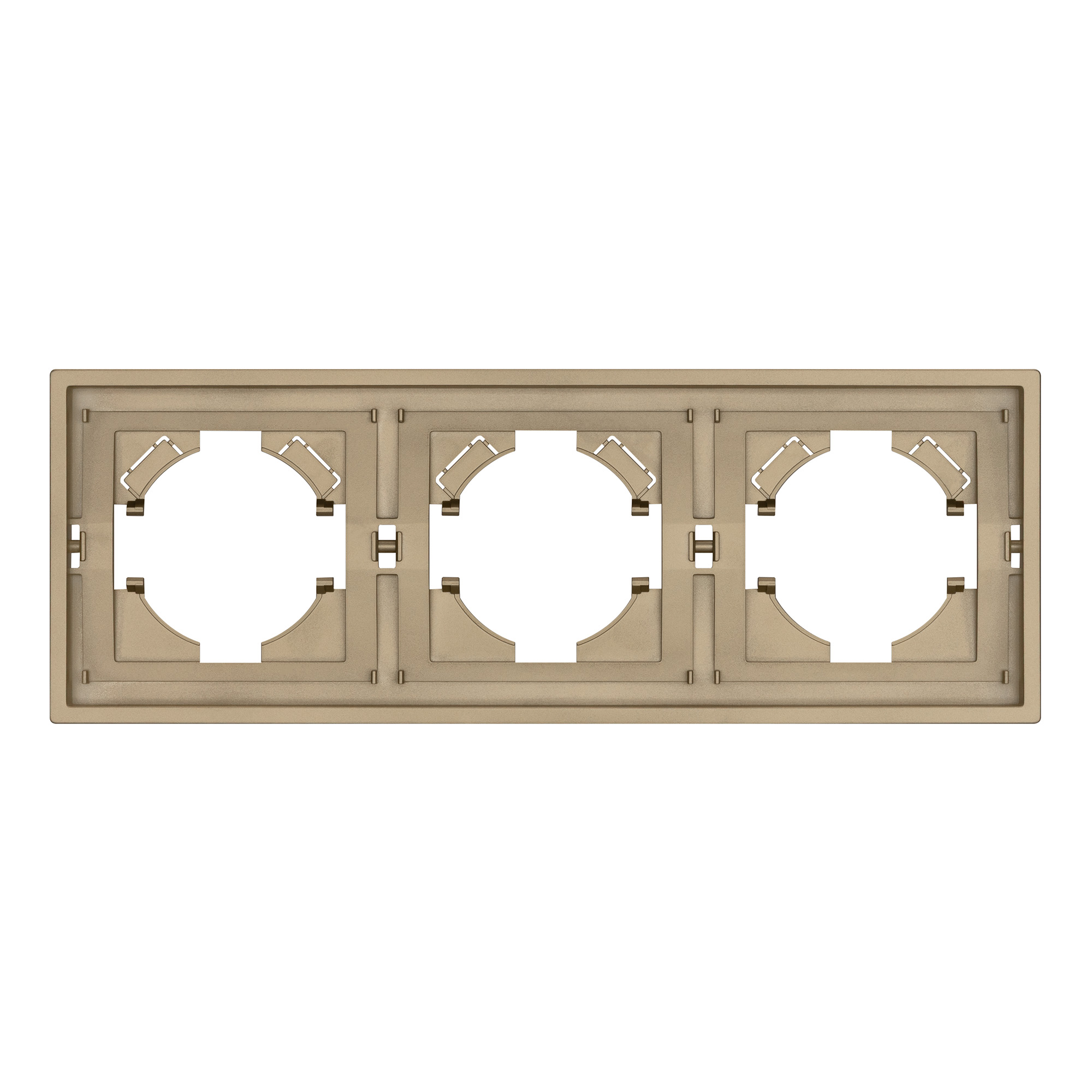 Рамка пластиковая на 3 поста, под встраиваемый механизм. Цвет - золотой, с Soft-Touch покрытием. Среднего уровня герметичности IP20. Ориентация монтажа горизонтальная.