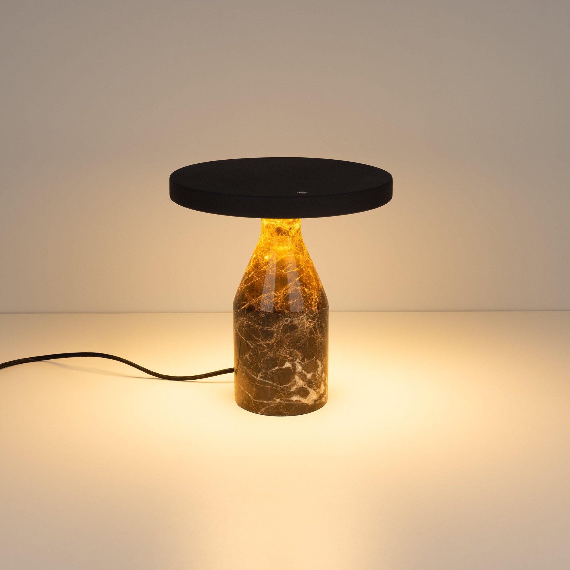 Настольный светильник CROOD. С изменяемой цветовой температурой 2700/3200/4000K, переключается коротким нажатием на сенсорную кнопку на плафоне, диммирование происходит за счет ее удержания. Мощность 7 Вт, св. поток 159 лм, 23 лм/Вт, CRI>94, угол 140°, напряжение питания 230 В. Черный плафон из алюминия, основание из мрамора, степень защиты IP20. Общая высота 240 мм. Габариты светового модуля DхH: 225 x 22 мм. Габариты основания DхH:: 100 x 220 мм. Пульсация <1%.