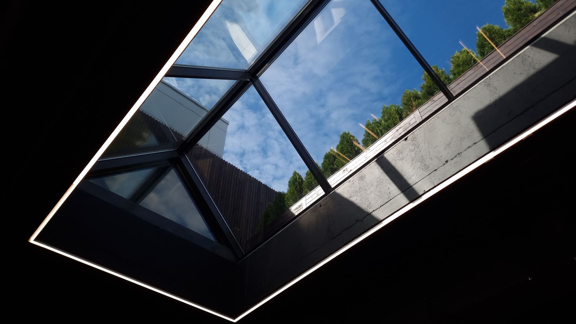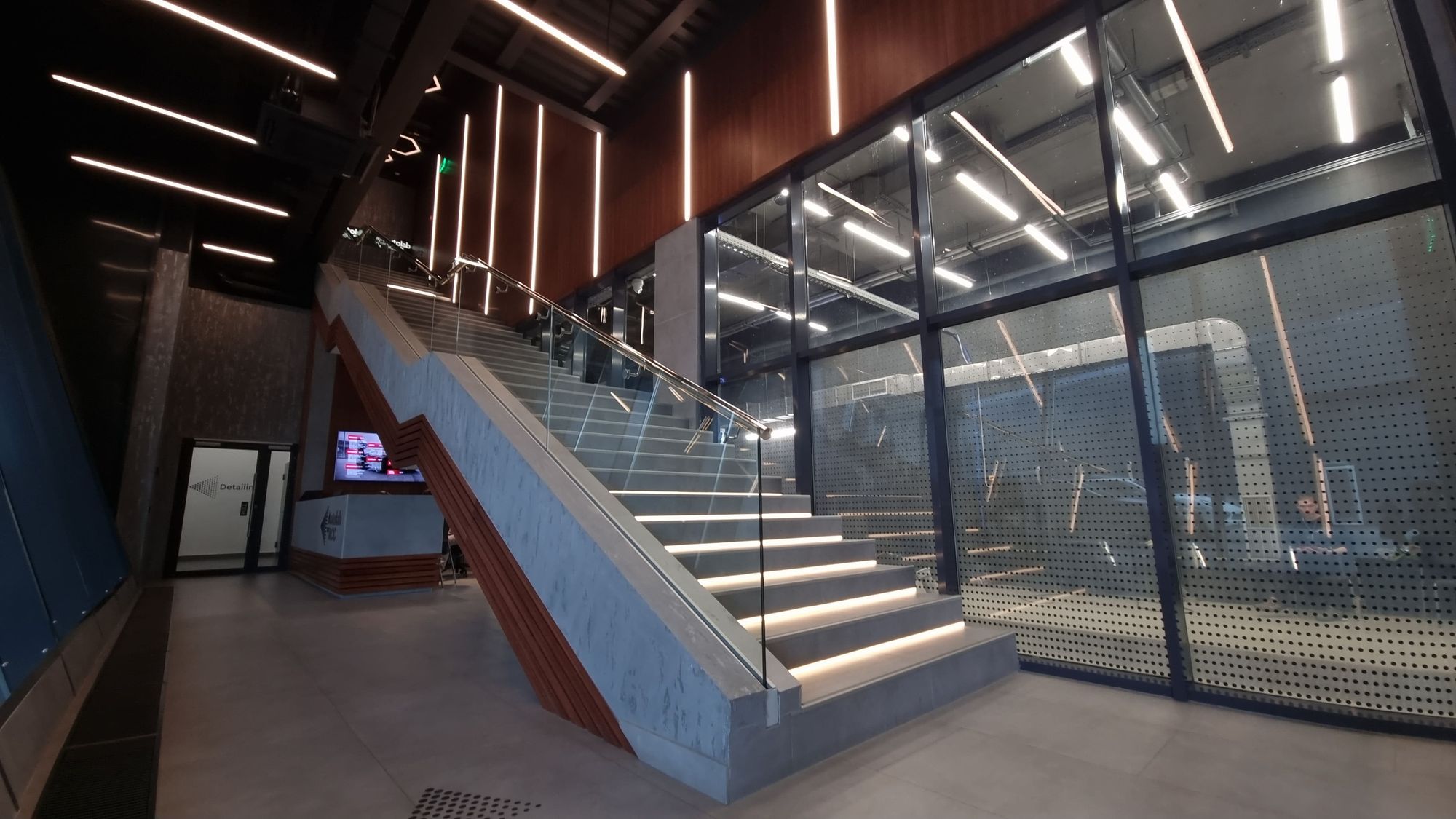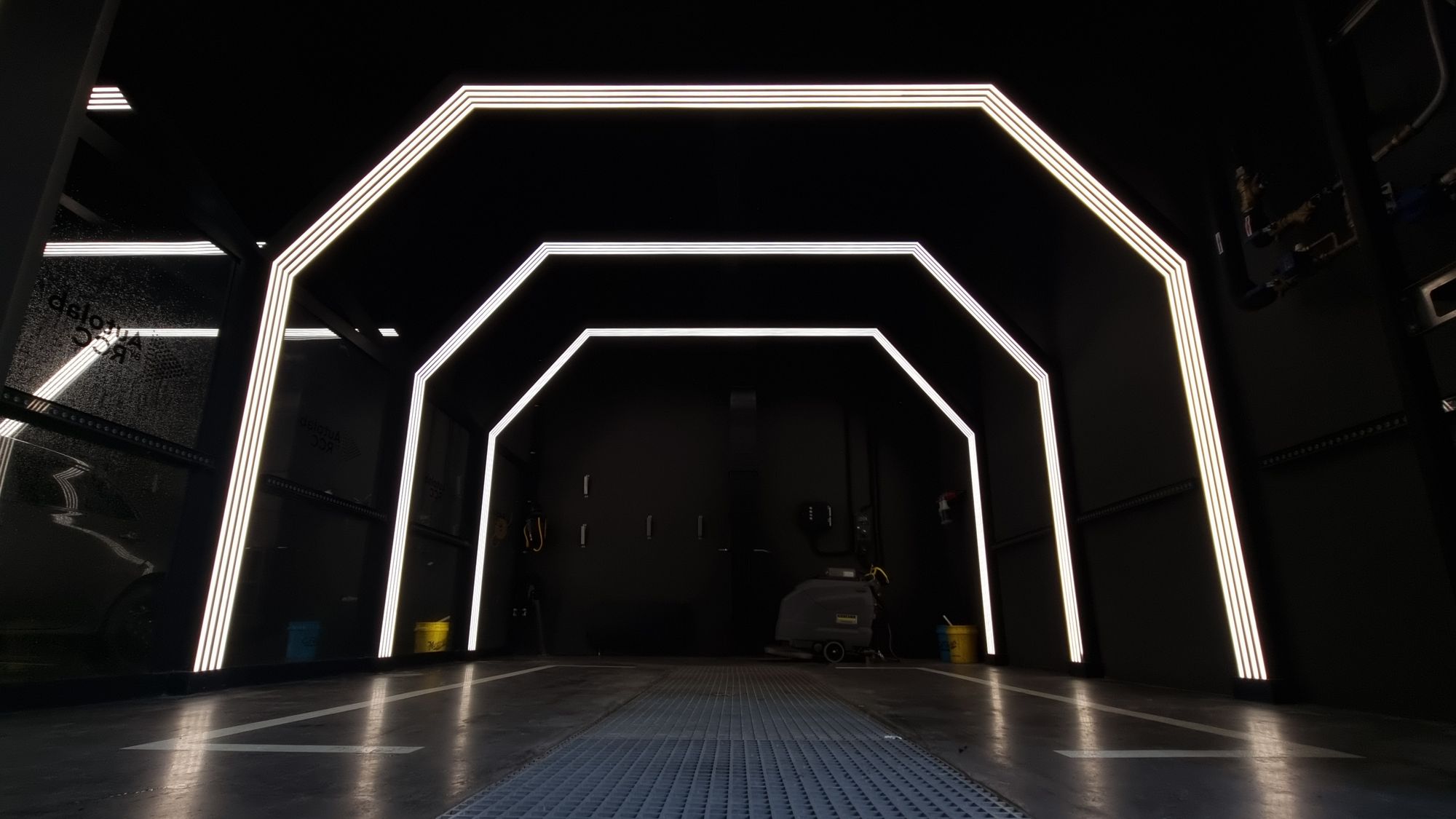 Зона автомойки просторна и функциональна. Световые порталы локально освещают каждую ячейку для мытья машин, а также погружают посетителей в атмосферу фильмов про автогонки и красивые машины. Свечение белого цвета контрастно смотрится на фоне темно-серого интерьера. При этом обстановка эмоционально не давит на посетителей благодаря пирамидальному участку крыши из стекла, через который проходит естественный свет.