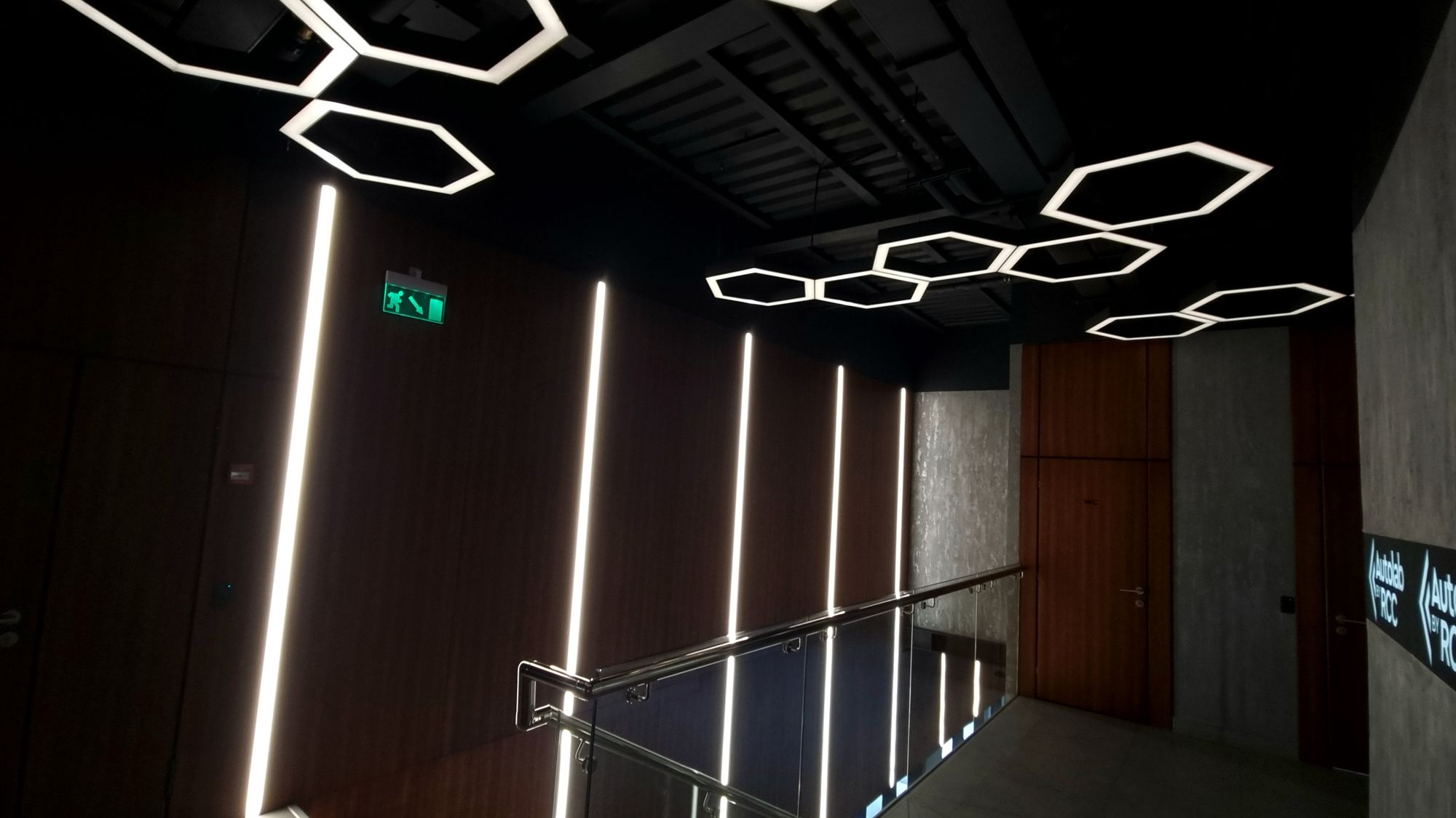 Автомобиль визуально состоит из металла, стекла и света фар — все три составляющих входят в основу лаконичного интерьера МФЦ: темно-серые и металлические оттенки стен, пола и потолка, прозрачные перегородки, зонирующие пространство, и множество световых линий, которые формируют упорядоченную геометрию.