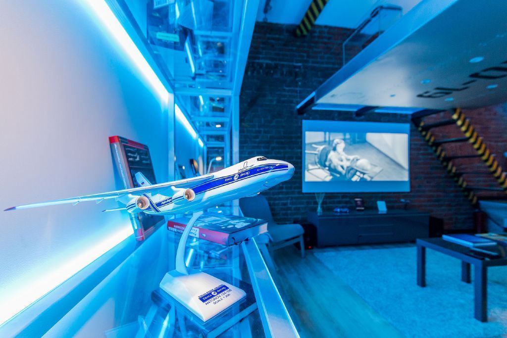 В зоне кухни на тросиках были подвешены линейные светодиодные светильники из алюминиевого профиля и светодиодной ленты RGB. Для подсветки других зон помещения, в частности пола спальной зоны, расположенной на втором уровне студии, была использована синяя светодиодная лента Arlight. Такая подсветка подчеркивает авиационную тематику интерьера, напоминая о голубом небе.