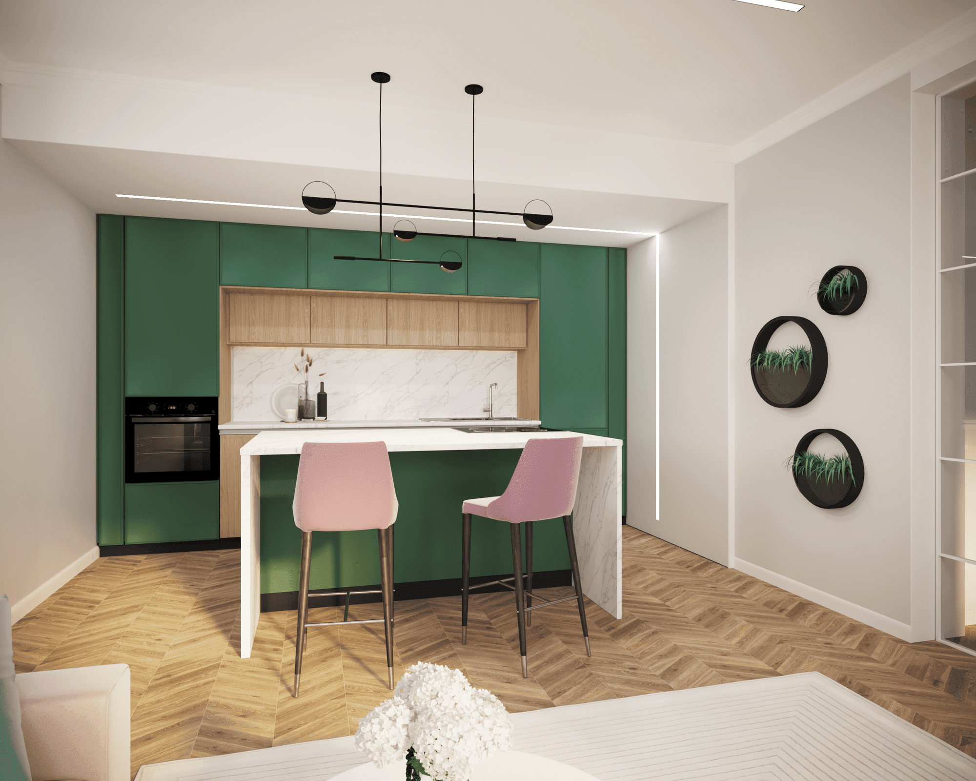 В проекте применялись анодированные профили с экраном и светодиодные ленты дневного белого свечения. Тонкие световые линии гармонично интегрированы в различные помещения. Другая часть основного освещения создана с помощью больших потолочных светильников, которые выразительно контрастируют с простыми линейными светильниками.